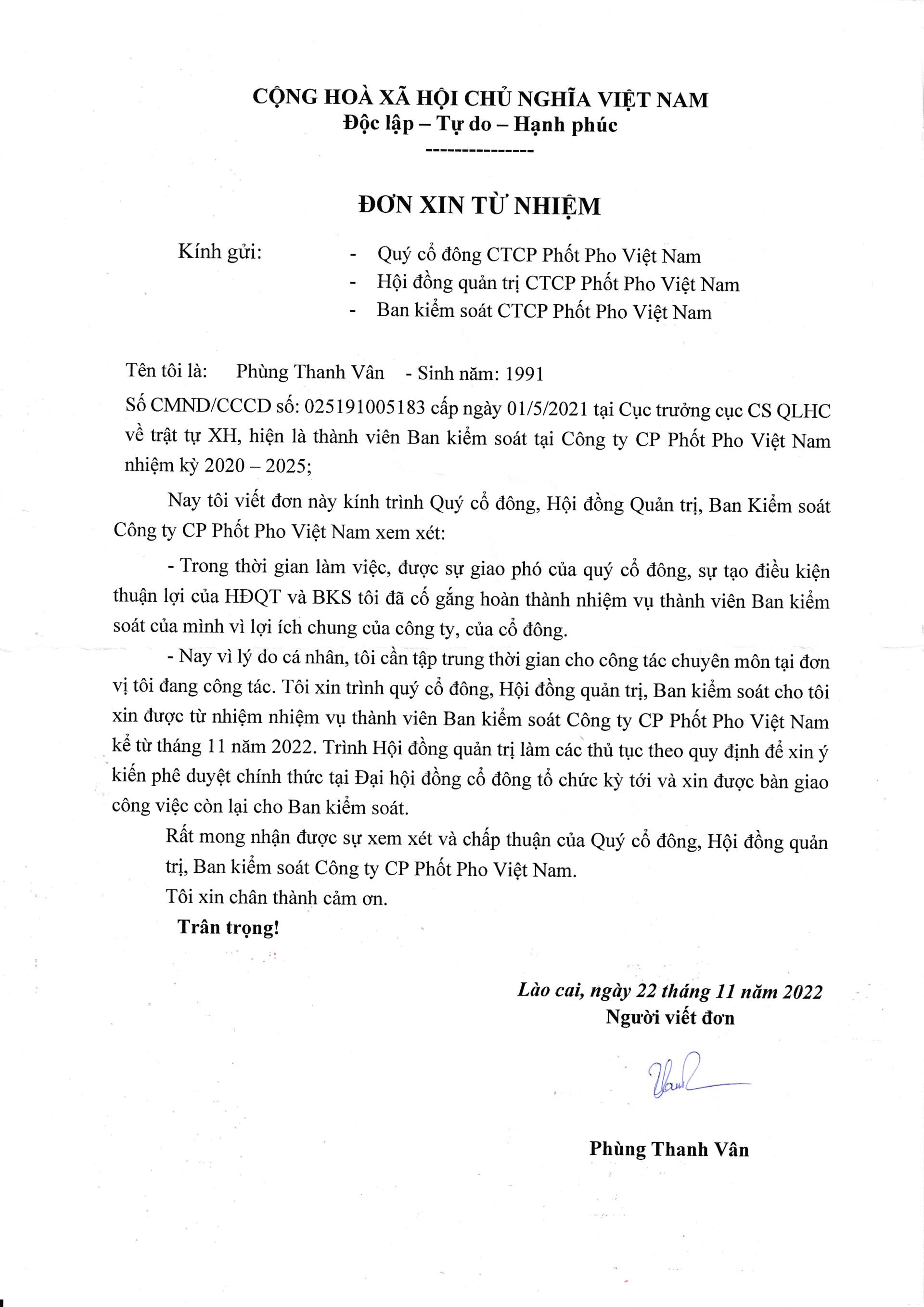 ĐƠN XIN TỪ NHIỆM THÀNH VIÊN BAN KIỂM SOÁT